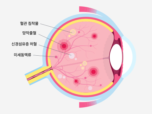 당뇨병으로 인해 망막에 혈액을 공급하는 말초혈관에 순환장애가 일어나 발생합니다.